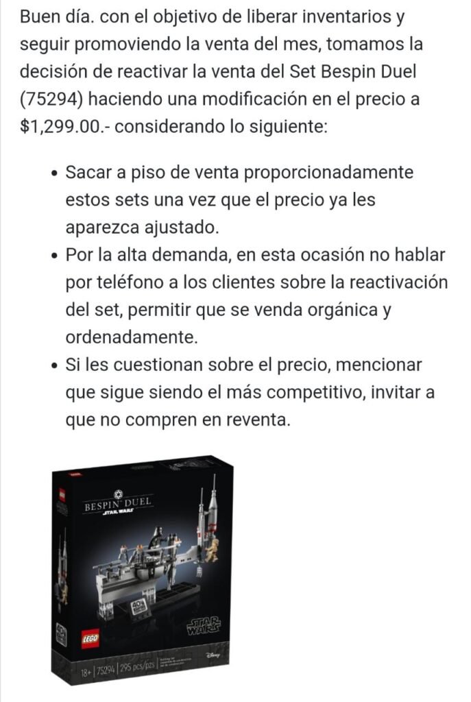 Este comunicado me lo mandó tal cual un amigo de la LEGO Store cuando le pregunté si aún tenían este set en existencia. Fue dirigido a empleados para que sepan que pueden venderlo pero a ese precio elevado. Lo comprobé llendo a la LEGO Store y me dijeron que si costaba eso ahora. También, en mi post de Facebook ya salió una persona que lo compró a ese precio!!