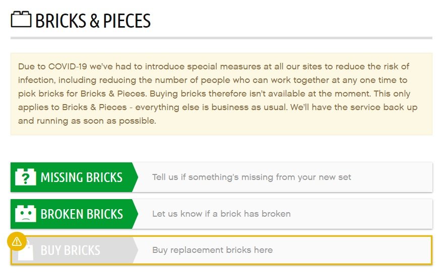 LEGO Bricks & Pieces sin servicio por el Coronavirus