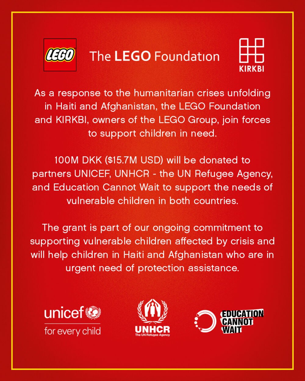 Ayer, la LEGO Foundation y KIRKBI han anunciado que estarán donando 100M DKK para ayudar a niños vulnerables en Haití y Afganistán. La donación es lo equivalente a $15.7 millones de dólares estadounidenses. Estos fondos se destinarán a organizaciones como UNICEF, UN Refugee Agency (UNHCR), y Education Cannot Wait (ECW). Estas organizaciones se dedican a ayudar a niños, y hay muchos siendo afectados ahora por los acontecimientos en ambos países.