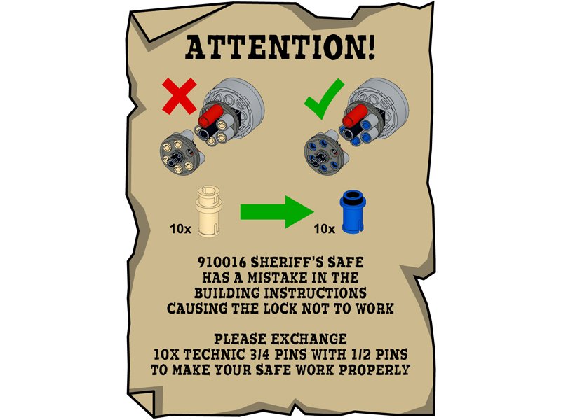 Para todos aquellos que compraron el BrickLink Designer Program Sheriff’s Safe (910016), hay un problema con el diseño que debes saber. El diseñador fan notó que LEGO o BrickLink decidieron cambiar unas de las piezas Technic para el mecanismo del seguro. Este cambio hizo que la caja fuerte no cierre.