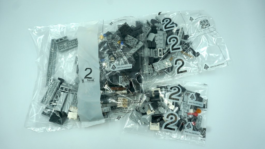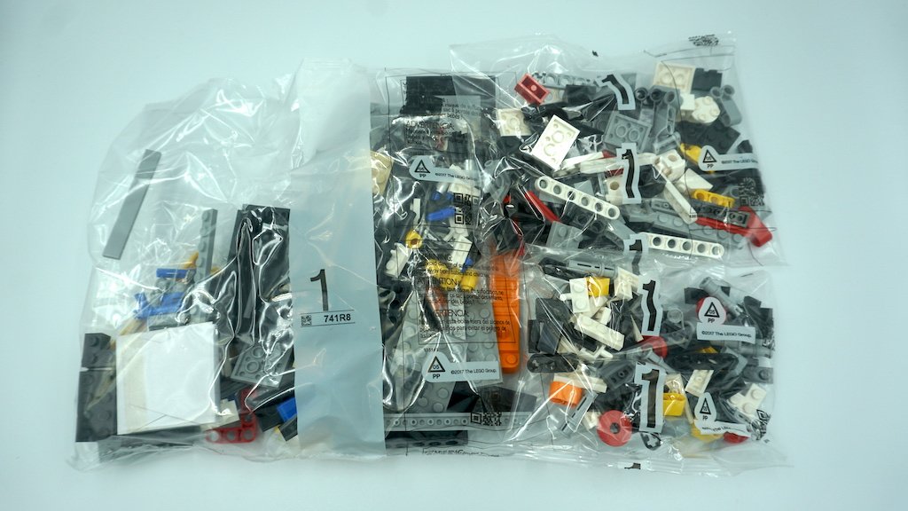 Al abrir la caja, hay bastantes bolsas, el instructivo de construcción, y un set de calcomanías. LEGO te divide la construcción en cuatro pasos a grandes rasgos. Existen tres bolsas con el número 1, 2, y 3, así como dos bolsas con el número 4 y una bolsa no numerada. Los sets de bolsas del 1 al 3 cuentan con una bolsa grande, una mediana, y una última más pequeña, mientras que las numeradas con el 4 es una grande y una mediana. Por último, la bolsa que no está numerada contiene las llantas y el eje (pieza larga y roja) principal del carro.