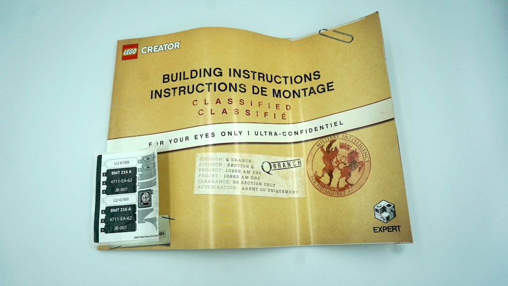 El libro de instrucciones se me hizo bastante diferente a los demás. Para empezar, la portada del instructivo no es igual que la portada de la caja. En vez, LEGO optó por hacerte sentir como un super espía y entregarte un expediente secreto. Al abrir las primeras páginas, te viene un poco de historia acerca del Aston Martin DB5 y su relación con la franquicia de James Bond. La introducción del instructivo viene tanto en inglés como en francés.