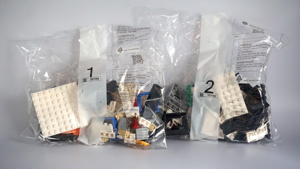 Lo que más se me hizo complicado de esta construcción fue el identificar rápidamente las piezas necesarias por paso. Como todo el exterior del casco es mayormente blanco, era muy difícil identificar las piezas rápidamente. Si ves las imágenes de arriba, domina el color blanco dentro de las bolsas numeradas. Las primeras dos bolsas tenían más color y construyeron el soporte y el núcleo del casco. Lo complicado fue la fachada del casco, que predomina el blaco y tiene piezas con figuras similares.