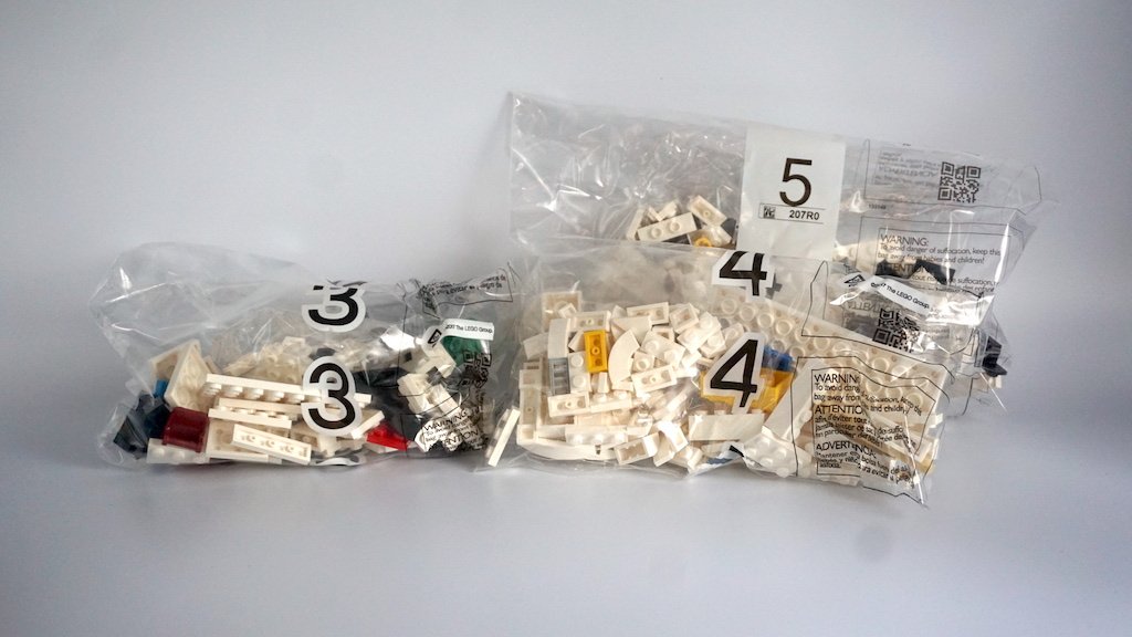 Lo que más se me hizo complicado de esta construcción fue el identificar rápidamente las piezas necesarias por paso. Como todo el exterior del casco es mayormente blanco, era muy difícil identificar las piezas rápidamente. Si ves las imágenes de arriba, domina el color blanco dentro de las bolsas numeradas. Las primeras dos bolsas tenían más color y construyeron el soporte y el núcleo del casco. Lo complicado fue la fachada del casco, que predomina el blaco y tiene piezas con figuras similares.