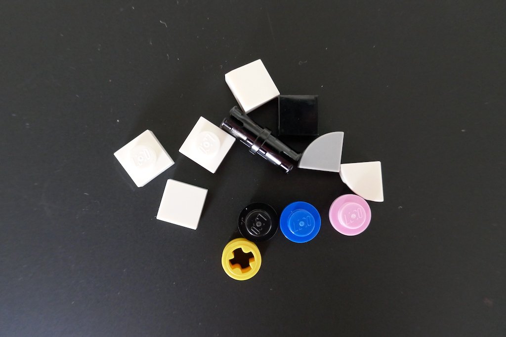 Las piezas que me sobraron, como pueden ver, son mayormente blancas. De las casi 650 piezas, me sorprendió las pocas piezas que me sobraron. Solamente 11 piezas de 1×1 y una unión estilo Technic me sobraron. Esto es indicación de que la construcción fue basada en mayormente piezas grandes, que normalmente no llevan piezas de repuesto.