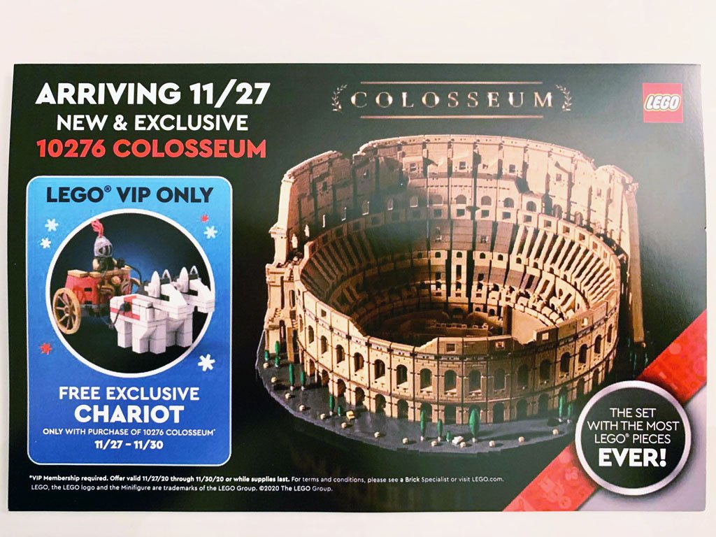 Hace una par de días, LEGO anunció de manera oficial el nuevo juego de LEGO Coliseo (10276). En el comunicado de prensa, se mencionó un set de regalo del Carruaje Romano cuando compras el Coliseo durante las promociones de Black Friday 2020. Ahora tenemos una clara imagen de cómo se ve este set de regalo gracias a los folletos que están distribuyendo en las LEGO Stores. Como puedes ver en la imagen de arriba, es un carruaje jalados por dos caballos construidos de blocks. También se incluye una minifigura de un romano. La promoción correrá del 27 al 30 de noviembre, hasta agotar existencias.